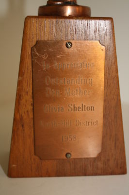 Trophy reads, "In Appreciation Outstanding Den Mother Olivia Shelton North-Hill District 1958"