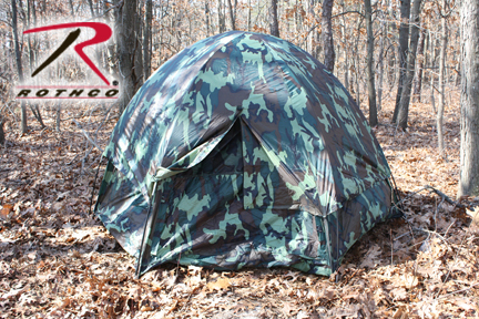 Camouflage 3-Man Hexagon Dome Tent Constructed of polyurethane coated taffeta with poles and stakes. Waterproof and fire resistant. Includes polyethylene floor, zippered front door and window. Measures 8' x 7' x 4' and weighs 7 pounds 6 ounces. SKU: 3809. Manufactured by Rothco.