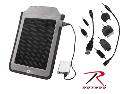 Multi-Functional Solar Charger Panel Never be without power. This charger can be charged in sunlight for 2-3 hours or from any USB port for 2 hours. Includes 6 adaptors, 1 USB cable and 1 charging cable. Compatible with most i-Phones, Motorola V3, Motorola V66, Nokia 6101, Samsung A288, Sony Ericsson K 750 and many more, as well as i-Pods and most other media players. SKU: 80005. Manufactured by Rothco.