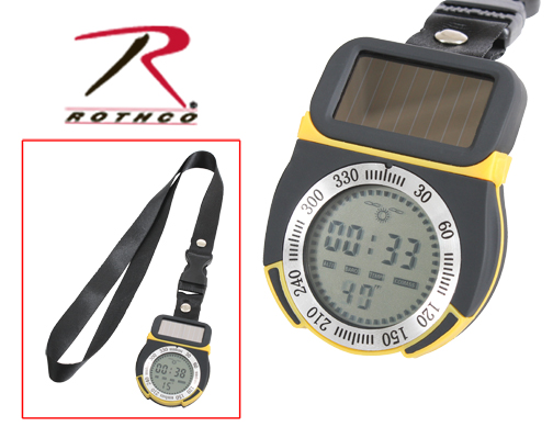 Solar Multi-Function Digital Compass Includes altimeter (calibrated in 1 meter increments), barometer, weather forcast, time (to the second, 24 hour clock. Available), compass and thermometer. Measure 3" x 6" x 2.25" SKU: 80008. Manufactured by Rothco.
