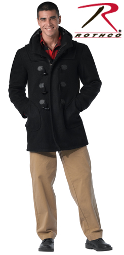 Black Wool Navy Duffle Coat Constructed of 22 oz fabric with nylon lining. Includes four toggle buttons with leather patches, dual brass zpper and attached hood. SKU: 8725. Available in Sizes XS-XL. Manufactured by Rothco.