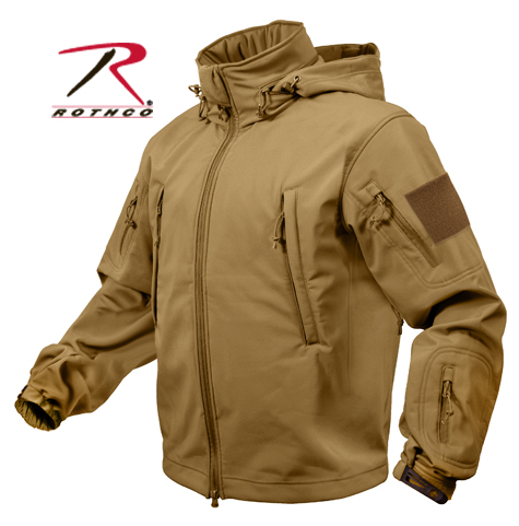 Coyote Brown Special Ops Soft Shell Jacket-2XL This jacket is full of features desired by many and required by professionals. It has 9 zippered pockets, plus a zip away hood. The three layer construction contains body heat while wicking away moisture. The polyester construction is water proof, durable, breathable and lightweight. Hook and loop section on each shoulder for attaching patches. Adjustable waist, hood and cuffs.. Available in most sizes and various colors. SKU: 9868. Manufactured by Rothco.