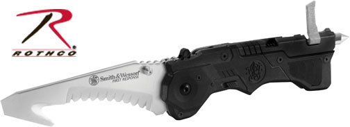 Smith & Wesson First Response Assisted Opening Knife Blade is constructed with 4034 stainless steel. Handle is constructed of nylon. Includes spring-loaded glass breaker, seatbelt cutter, liner lock, safety lock and pocket clip. 3.5" long blade. SKU: 3363. Manufactured by Rothco.