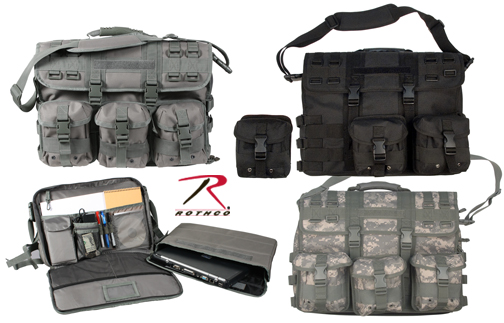 M.O.L.L.E. Tactical Laptop/Briefcase- Army Digital Camo, Black or Foliage Green (Your Choice) Constructed of 600 Denier polyester with MOLLE loops on back and three MOLLE pouches on front. Includes carry handle and adjustable shoulder strap. Measures 17.5" x 12.5" x 6". Pleanty of space for a portable office. SKU: 3131. Manufactured by Rothco.