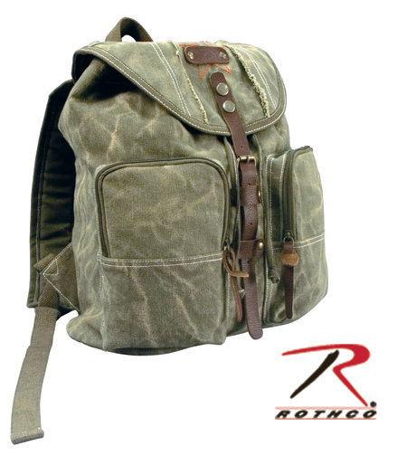 heavyweight Olive Drab Stonewashed Backpack with Leather Accents includes four zippered pockets, one large drawstring compartment with flap and padded, adjustable should straps. Measures 10" x 14" x 6". SKU: 9168. Manufactured by Rothco.
