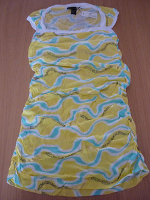 This is a great mini dress/beach cover up by Just Cavalli. Its brand new with tags and comes in bag. The dress is a light weigh mini dress with ruched details at the sides. The dress is a UK SIZE 12 and its mainly yellow & white with Just Cavalli printed on in black & gold. The dress is a great designer buy for your summer holidays. That you will be able to enjoy year after year.
