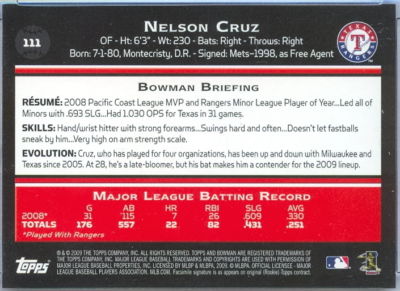 | 2009 Bowman # 111 Nelson Cruz Texas Rangers |