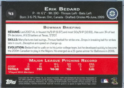 2009 Bowman # 43 Erik Bedard Seattle Mariners |