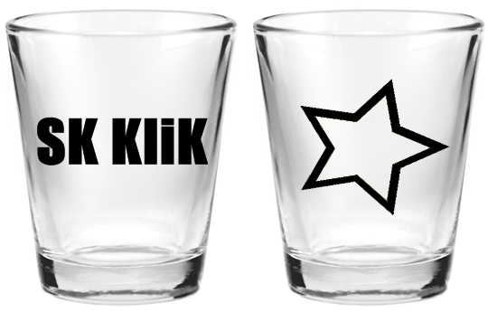 1.5 ounce shot glass with SK KliK written in black on the front and a black star on the back.