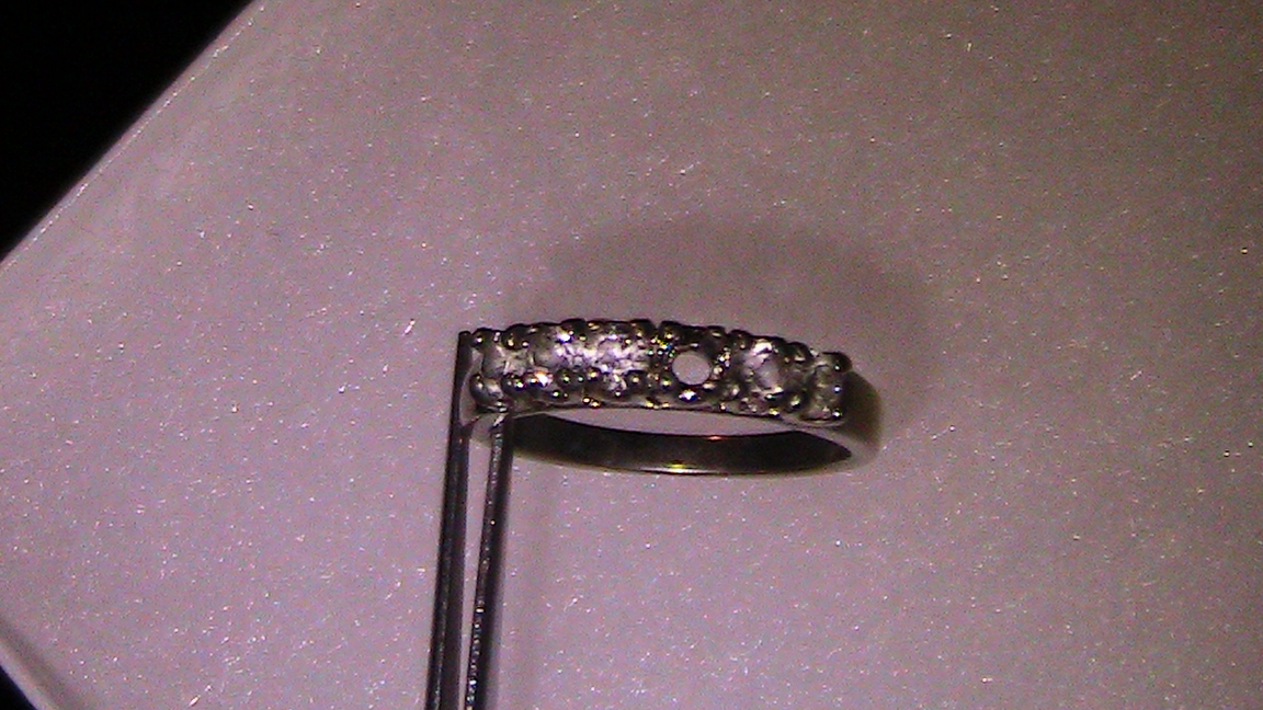 Stamped 18KGE and missing one stone (unknown stone). Size 8