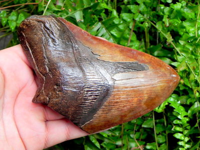 The megalodon shark lived in the Miocene/Pliocene era approximately 12 million years ago. Megalodon grew up to 60 feet long and had a deadly arsenal of 147 razor sharp teeth. There have been teeth found that exceed 7" long ! The formula for figuring length of the shark is done by the primary tooth measurements . Standard Measurements are taken from the tip to the longest root side. For every eighth of an inch equals 1 foot in length. There fore a 7" tooth would be 56' long. The megalodon fed on whales squid,large fish and anything that moved. The power of its jaws was incredible. They could slash through vertebrae and rib bones with ease. They could even slice through their own teeth teeth!