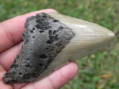 The megalodon shark lived in the miocene/ pliocene era approximately 12 million years ago. Megalodon grew up to 60 feet long and had a deadly arsenal of 147 razor sharp teeth. There have been teeth found that exceed 7" long ! The formula for figuring length of the shark is done by the primary tooth measurements . Standard Measurements are taken from the tip to the longest root side. For every eighth of an inch equals 1 foot in length. There fore a 7" tooth would be 56' long. The megalodon fed on whales squid,large fish and anything that moved. The power of its jaws was incredible. They could slash through vertabrae and rib bones with ease. They could even slice through their own teeth teeth!