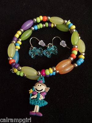 Child size beaded bracelet 2 line beaded to stretch and fit most child or small adult wrist rubber charm measures approx 1" matching bow earrings I do combine shipping so please look at my other items