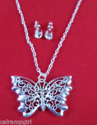 butterfly pendent measures approx 1 1/2" x 1 1/2" 18 inches silver chain with 3 inch extender . includes crystal stud stone earrings
