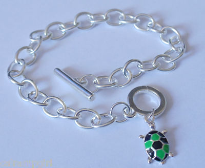 7 1/2" long silver tone toggle clasp bracelet. has enamel charm aprox 1/2" in size Individually wrapped
