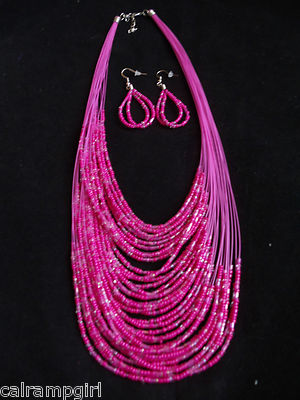 PINK FUSCHIA BEADED LAYERED BIB NECKLACE EARRINGS SET