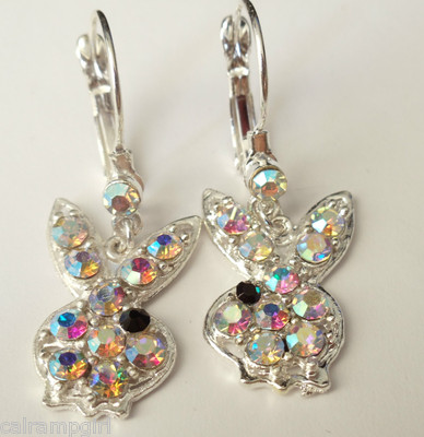 Beautiful playboy bunny crystal earrings loaded with shimmering clear crystals that reflect colors around them off of the stones giving it a multi colored effect hang appox 1 1/2" bunny is 1" in size I do combine shipping so please look at my other items.