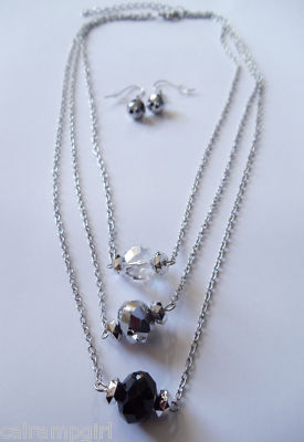 beautiful quality 18" silver chain 3" extender 3 chains are grouped at the top to form one necklace each chain has a crystal stone black silver and clear matching earrings I do combine shipping so please look at my other items.. other styles and colors are available in store