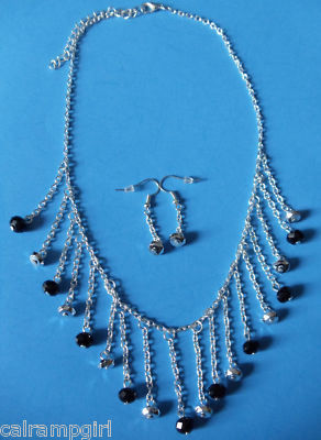 Necklace Earrings Set dangling crystals silver black