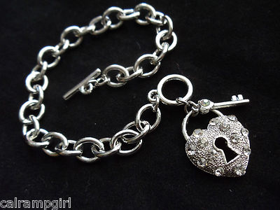 Silver Heart lock and key Charm Bracelet chain link Clear crystal stones
