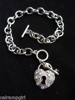 Silver Heart lock and key Charm Bracelet chain link Shimmering crystal stones
