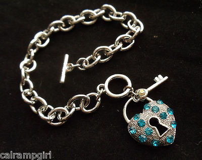 Silver Heart lock and key Charm Bracelet chain link Teal Blue crystal stones