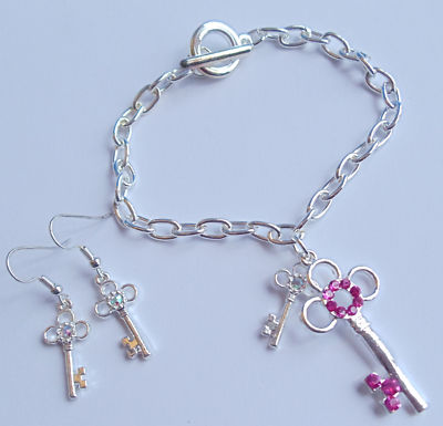 Silver Key Charm Bracelet earrings set Pink stones