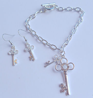 silver tone 7 1/2 inch chain toggle clasp. Great Quality Large key is 1 1/2" long earrings hang 1" I do combine shipping so please look at my other items.
