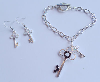 silver tone 7 1/2 inch chain toggle clasp. Great Quality Large key is 1 1/2" long earrings hang 1" I do combine shipping so please look at my other items.