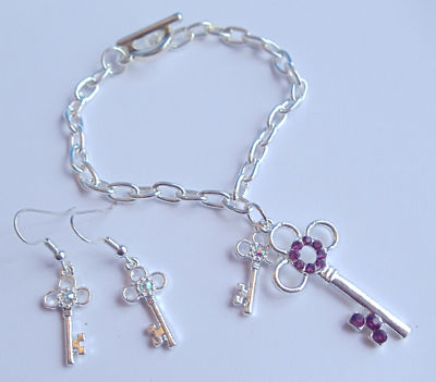 silver tone 7 1/2 inch chain toggle clasp. Great Quality Large key is 1 1/2" long earrings hang 1" I do combine shipping so please look at my other items.