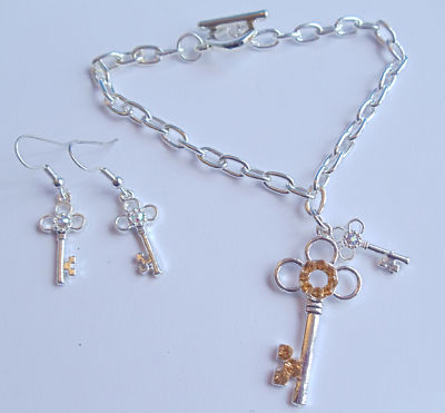 silver tone 7 1/2 inch chain toggle clasp. Great Quality Large key is 1 1/2" long earrings hang 1" I do combine shipping so please look at my other items.