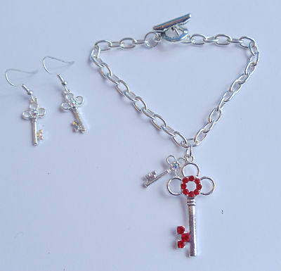 Silver Key Charm Bracelet earrings set Red stones