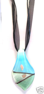 Beautiful glass pendent measures approx 2 1/2" x 2" handcrafted on a sheer ribbon necklace lobster clasp 16" long with 2" extender