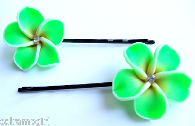 You will recieve 2 Clay Hawaiian Flower Plumeria Bobby Pins - metal 2.5 inches The flower's diameter is a little under 1.5" with a crystal in the center. The bobby pins are actually 2.25" but the flower expands out so the entire effect is 2.5" Bobby pins are black.