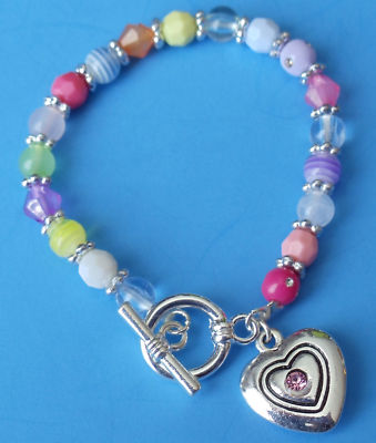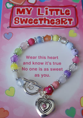 "My Little Sweetheart" bracelet with colorful beads & silver colored rondelles. The bracelet has a double-sided silvery Heart Charm with a pink rhinestone on each side. The bracelet was made to fit children but it is stretchy to fit all kids!! It has a toggle clasp and a beautiful sentiment that reads: "Wear this heart and know it's true - no one is as sweet as you. Also available in Princess and my little Angel. I do combine shipping so please look at my other items