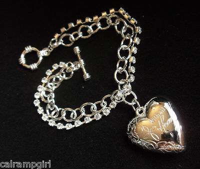 8" long silver tone bracelet 2 different chains grouped together to form 1. one line chain link one line crystal stones toggle clasp heart is aprox 1"x 1" engraved both sides. One side reads Love the Lord your God with all your heart Luke 10:27 other side reads with all your heart and has a cross. Individually wrapped