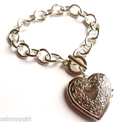 7 1/2" long silver tone toggle clasp bracelet. 1" x 1" hinged locket fits small picture inside. Individually wrapped