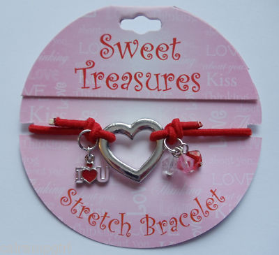 Heart silver toned on stretch material to fit most wrists. small heart charm individually carded and packaged. other styles and colors available in store Please look at my other items I do combine shipping