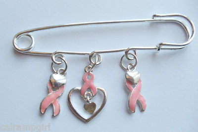 approx 3" long silver toned pin opens up like a safty pin to attatch to clothing. charms are pink ribbons approx 1/2" other styles available in store. I do combine shipping so please look at my other items.