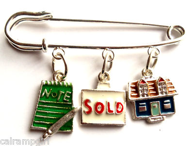 approx 2" long silver toned pin opens up like a safty pin to attatch to clothing. charms are of house sold sign and notes other styles available in store. I do combine shipping so please look at my other items.