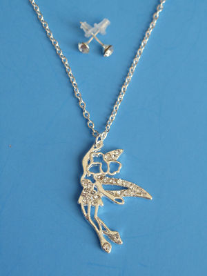 Silver with  crystal stones  fairy shaped measures 1 1/2"x 1"   stones along wing and feet holding Includes  18 inches silver chain and securely fastens together with a  lobster-claw clasp. includes matching crystal stud stone earrings