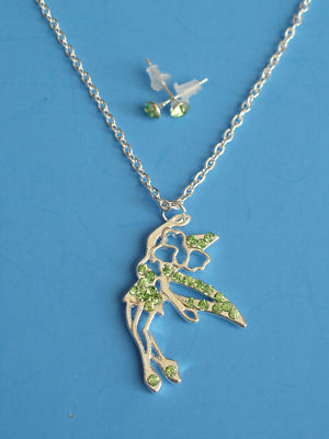 Silver with crystal stones fairy shaped measures 1 1/2"x 1" stones along wing and feet holding Includes 18 inches silver chain and securely fastens together with a lobster-claw clasp. includes matching crystal stud stone earrings
