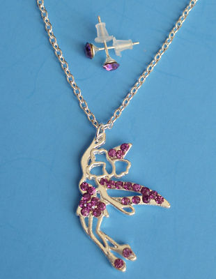 Silver with  crystal stones  fairy shaped measures 1 1/2"x 1"   stones along wing and feet holding Includes  18 inches silver chain and securely fastens together with a  lobster-claw clasp. includes matching crystal stud stone earrings
