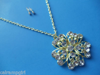 Flower Necklace Earrings set crystal Rhinestones Gold