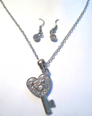 Silver with simulated diamond stones measures nearly 1inch beautiful quality Includes 18 inches silver chain and securely fastens together with a lobster-claw clasp. includes matching stud earrings I do combine shipping so please look at my other items.