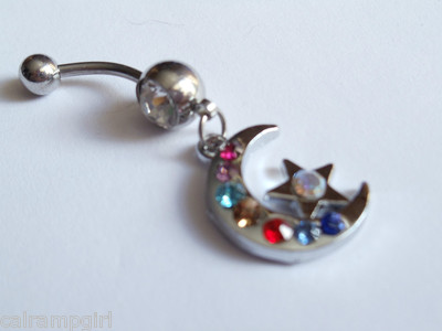 Moon and Star Rainbow Crystal Stones Navel Ring belly Button steel 316L