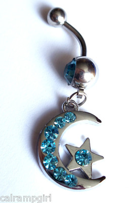 Moon and Star teal Crystal Stones Navel Ring belly Button steel 316L