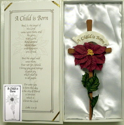 This New Romans Piece is titled a Child is Born. This piece is 9 1/2 inches tall resin cross with pointsetta in the middle