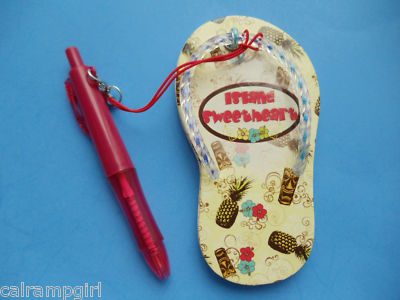 hard cover magnetic on back perfect for a fridge pad measures 4" x 2 1/2 " comes with matching ball point pen. as shown in picture and is attached to flip flop