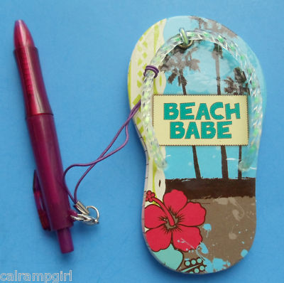 hard cover magnetic on back perfect for a fridge pad measures 4" x 2 1/2 " comes with matching ball point pen. as shown in picture and is attached to flip flop